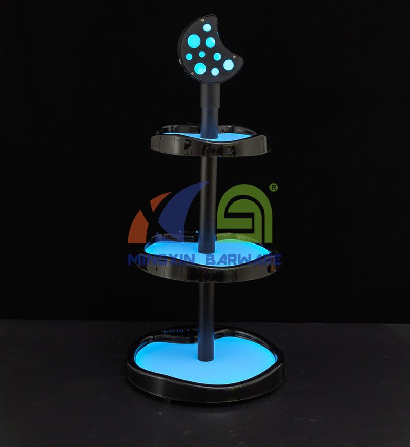 Three-layer LED serving tray. Fashionable round wavy bases. Perfect tray for fruits, drinks and snacks. Logo on top sign to show off your club.